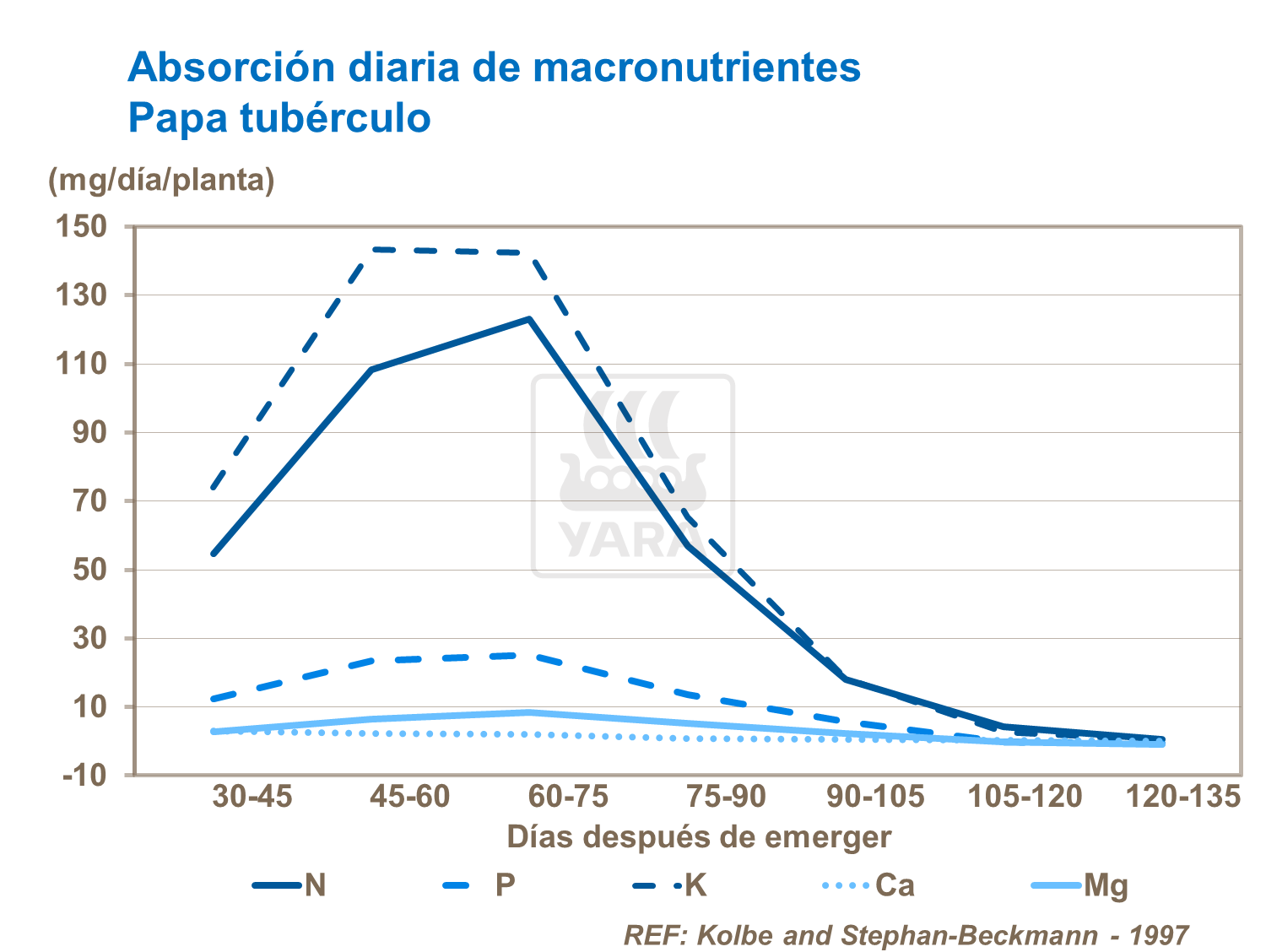 El potasio es sobre todo importante para obtener altos rendimientos, pero también para mantener la integridad de los tubérculos. “Absorción lujosa” de potasio es típica en papas. El nitrógeno es importante para desarrollo foliar y de los tubérculos. Igual que con potasio, mucho nitrógeno se recicla de las hojas al tubérculo durante la fase del llenado de estos.